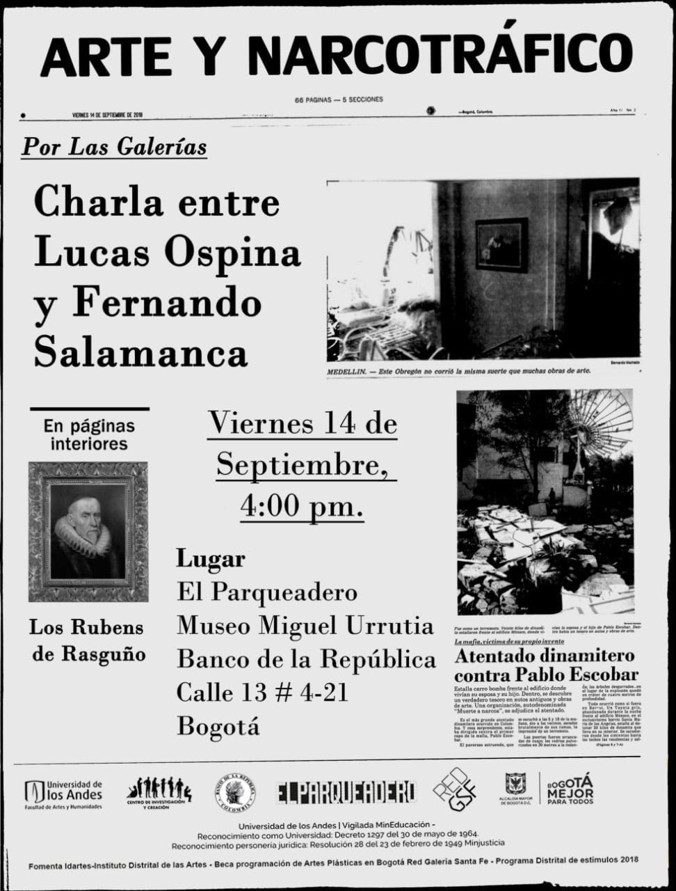 En el marco del proyecto Por las galerías se dará la charla Arte y narcotráfico entre Lucas Ospina y Fernando Salamanca. La charla tendrá lugar en El parqueadero del Museo de Arte Miguel Urrutia del Banco de la República.