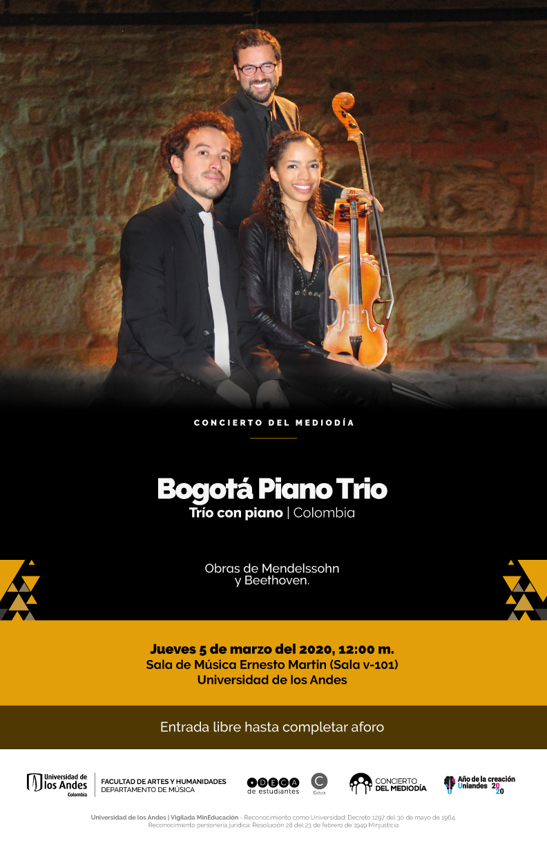 Sala de Música Ernesto Martin, Universidad de los Andes, Bogotá View mapFundado en 2016, el Bogotá Piano Trío lleva a sus espaldas presentaciones en reconocidos escenarios y festivales de Colombia. El trío ha colaborado también con compositores de Colombia, haciendo parte de estrenos mundiales. Sus integrantes son Anyango Yarbo-Davenport, violín (profesora Asistente de la Universidad Javeriana, Directora y Solista Colour of Music Virtuosi); Ivan Leon, cello (profesor de la U Javeriana y la U Central) y Mauricio Arias Esguerra (profesor asistente Uniandes)
