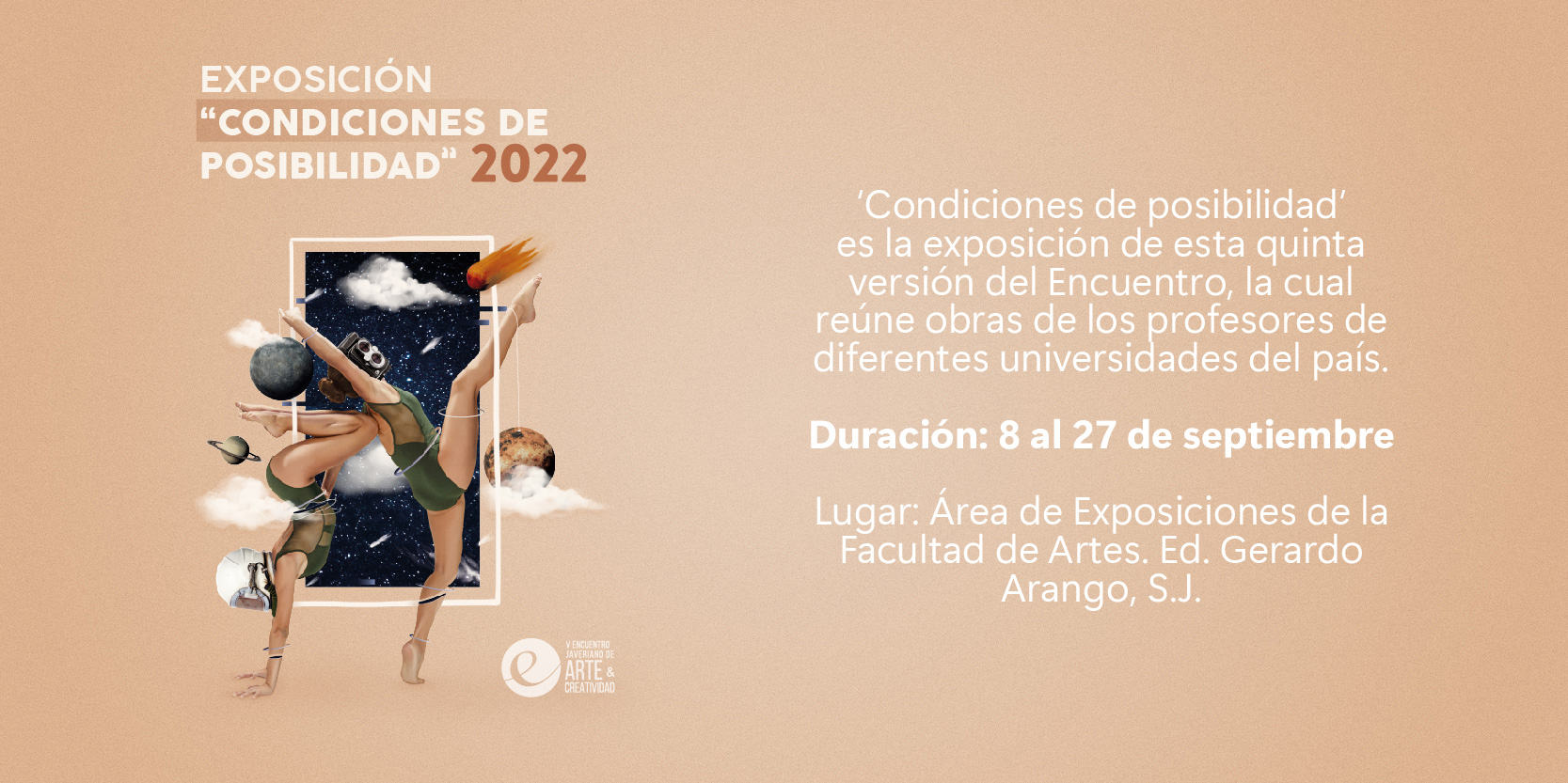 Edificio Gerardo Arango, Pontificia Universidad Javeriana View mapNuestros profesores Lina Espinosa y Juan Alonso hacen parte de la exposición Condiciones de posibilidad 2022, que reúne obras de profesores de diferentes universidades del país. La muestra se realiza en el marco del V Encuentro javeriano de arte y creatividad.