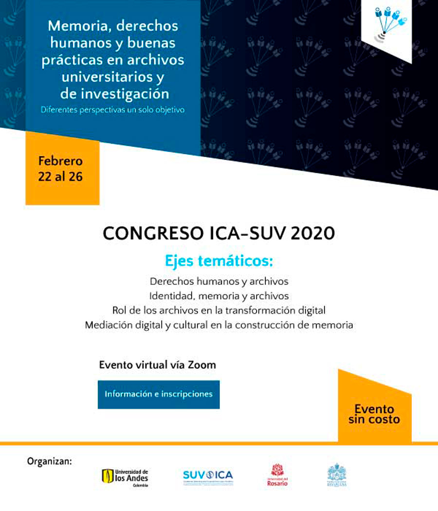 Evento en línea View mapDurante la semana del 22 al 26 de febrero de 2021 se llevará a cabo el Congreso virtual ICA-SUV 2020 sobre la memoria, los archivos de los derechos humanos y las buenas prácticas. El congreso transmitirá ponencias de investigadores provenientes de países de Latinoamérica y Europa en torno a cuatro ejes fundamentales: