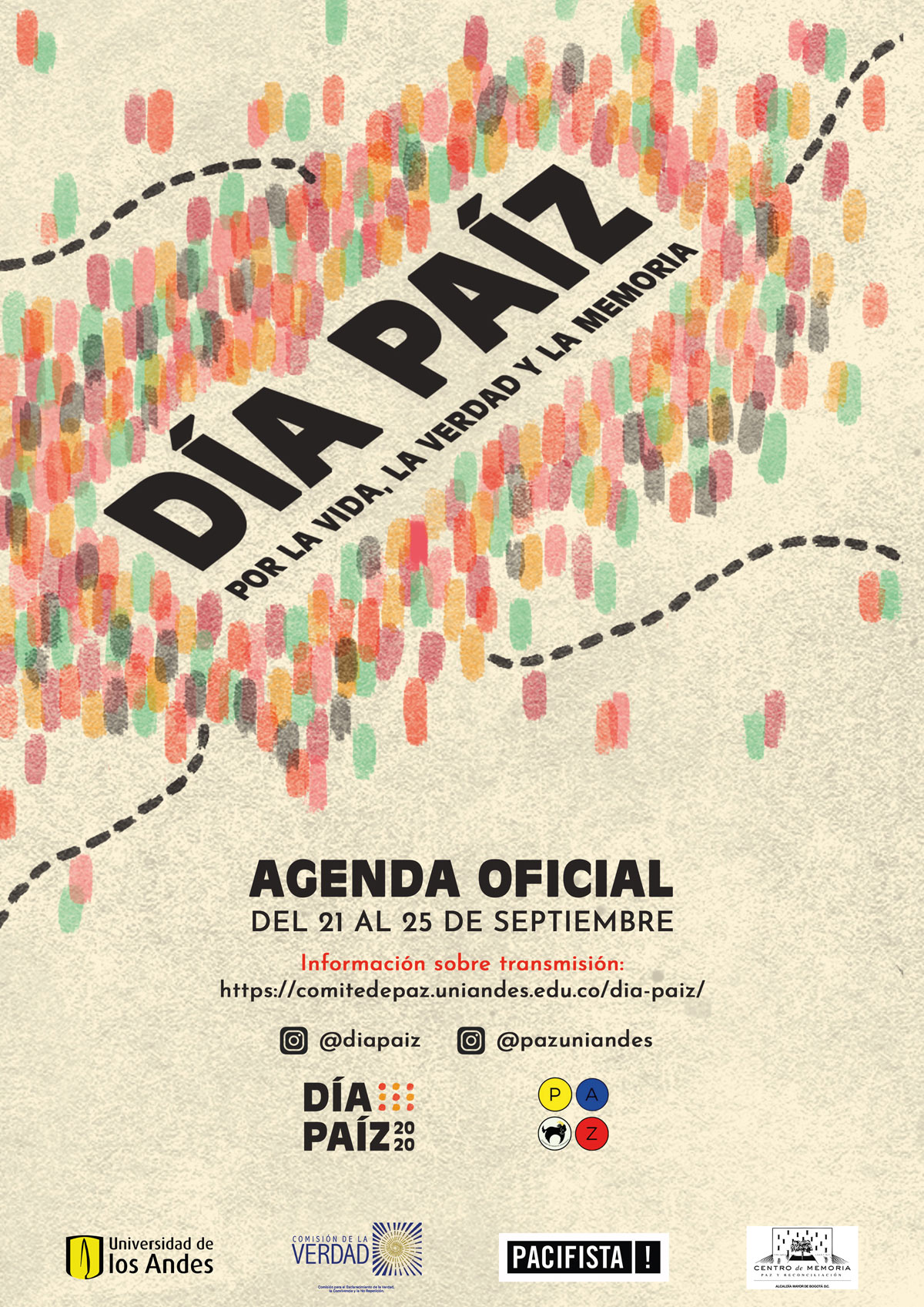 Universidad de los Andes, Bogotá View mapDía Paíz es un espacio de escucha y de encuentros para tejer diálogos en torno a la paz, la memoria, la vida y la verdad. En memoria de los 222 firmantes de paz y los más de 900 líderes y lideresas asesinadas, queremos invitarte a reflexionar sobre la situación del país para construir desde las diferencias y reconocernos como actores de cambio. Serán cinco días, del 21 al 25 de septiembre, llenos de conversatorios, actividades, talleres, películas y música ¡No te lo puedes perder!
