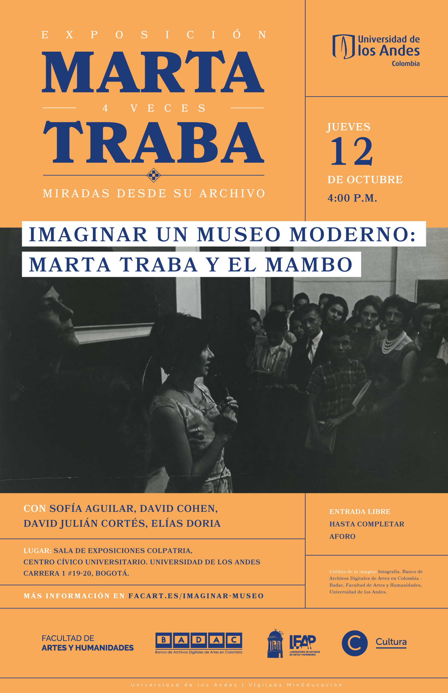 Sala de exposiciones Colpatria del Centro Cívico Universitario. Cra. 1 N° 19 - 20, Bogotá. View mapLa Facultad de Artes y Humanidades invita a la conferencia Imaginar un museo moderno: Marta Traba y el MAMBO con Sofía Aguilar, David Cohen, David Julián Cortés y Elías Doria. El jueves 12 de octubre a las 4:00 p.m. en la sala de exposiciones Colpatria del Centro Cívico Universitario de la Universidad de los Andes. Es un evento de entrada libre.