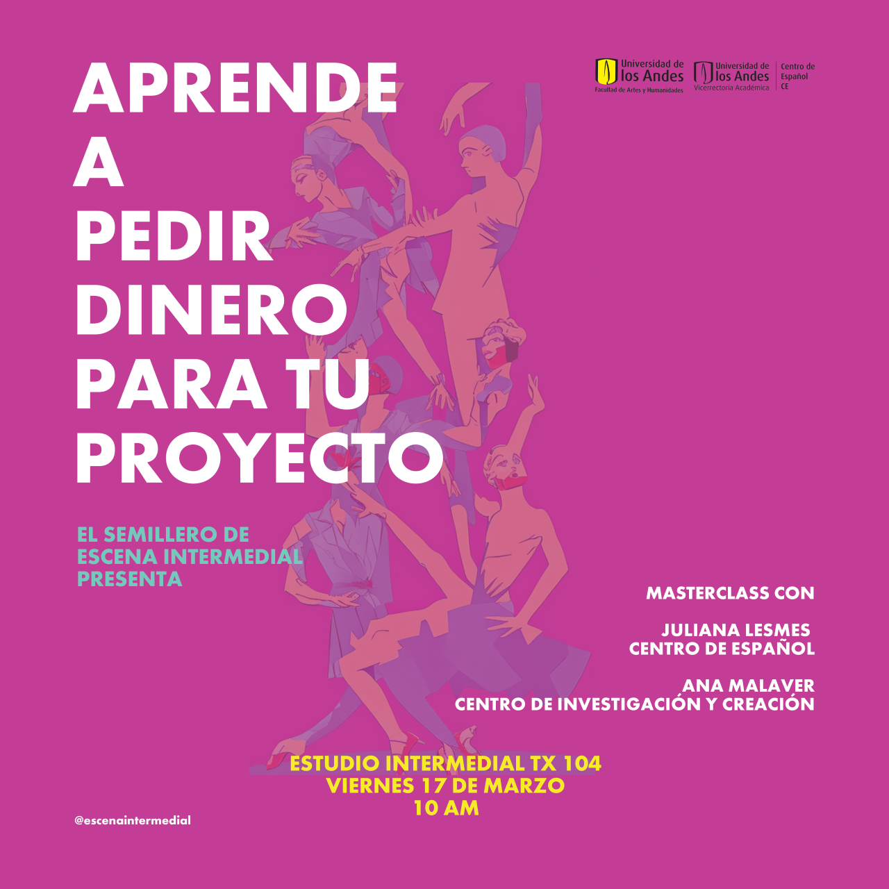 Estudio intermedial. Tx 104. Universidad de los Andes, Bogotá. View mapEl Semillero de Escena intermedial, el Centro de Español y El Centro de investigación y Creación CIC de la Facultad de Artes y Humanidades de la Universidad de los Andes invitan a la la Master Class Aprende a pedir dinero para tu proyecto con Juliana Lesmes y Ana Malaver.