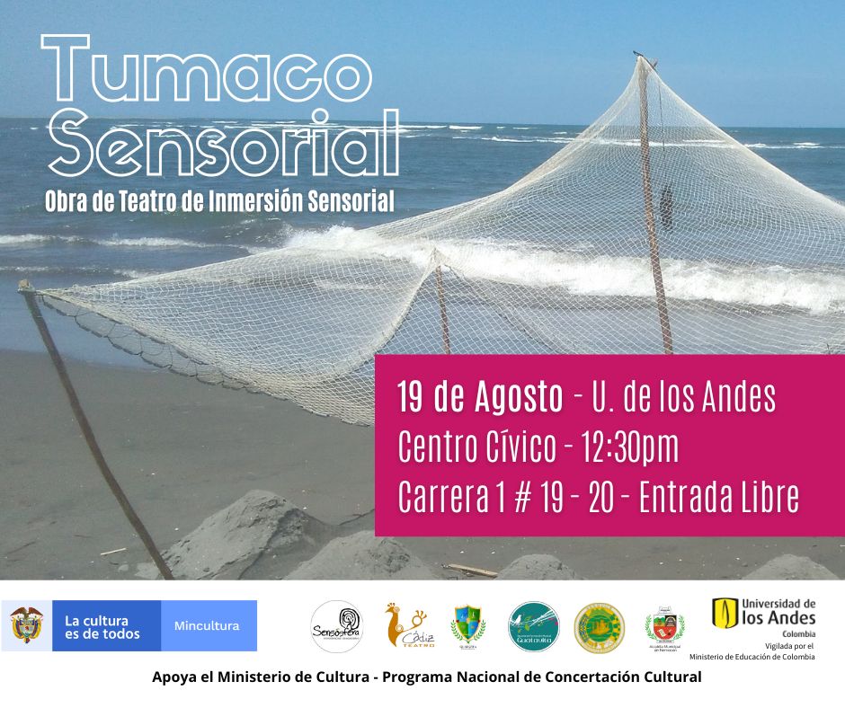 Hall Centro Cívico Universitario, Universidad de los Andes, Cra. 1A # 19 - 20 View mapTumaco Sensorial es una propuesta escénica de inmersión sensorial, que busca explorar las tradiciones y mitos del mundo afro del Pacífico por medio de una interacción directa entre espectadores y actores, y a través de una sucesión de escenas en las que se utilizan elementos olfativos, táctiles y sonoros.