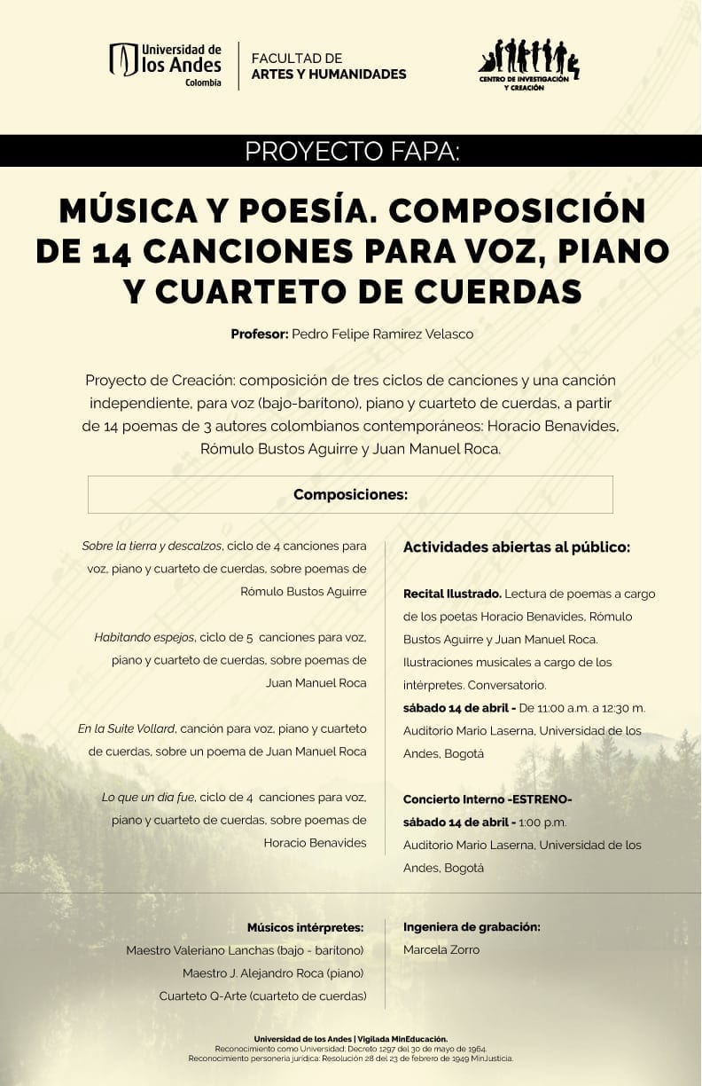 Son tres ciclos de canciones y una canción independiente escritos a partir de poemas de Horacio Benavides, Rómulo Bustos Aguirre y Juan Manuel Roca, que serán interpretados por Valeriano Lanchas, acompañado del pianista Alejandro Roca y del cuarteto de cuerdas Q-Arte. Darán dos conciertos abiertos al público: uno el 14 de abril en el Auditorio Mario Laserna de la Universidad de los Andes, y el otro el 21 de abril en el Museo Nacional de Colombia.