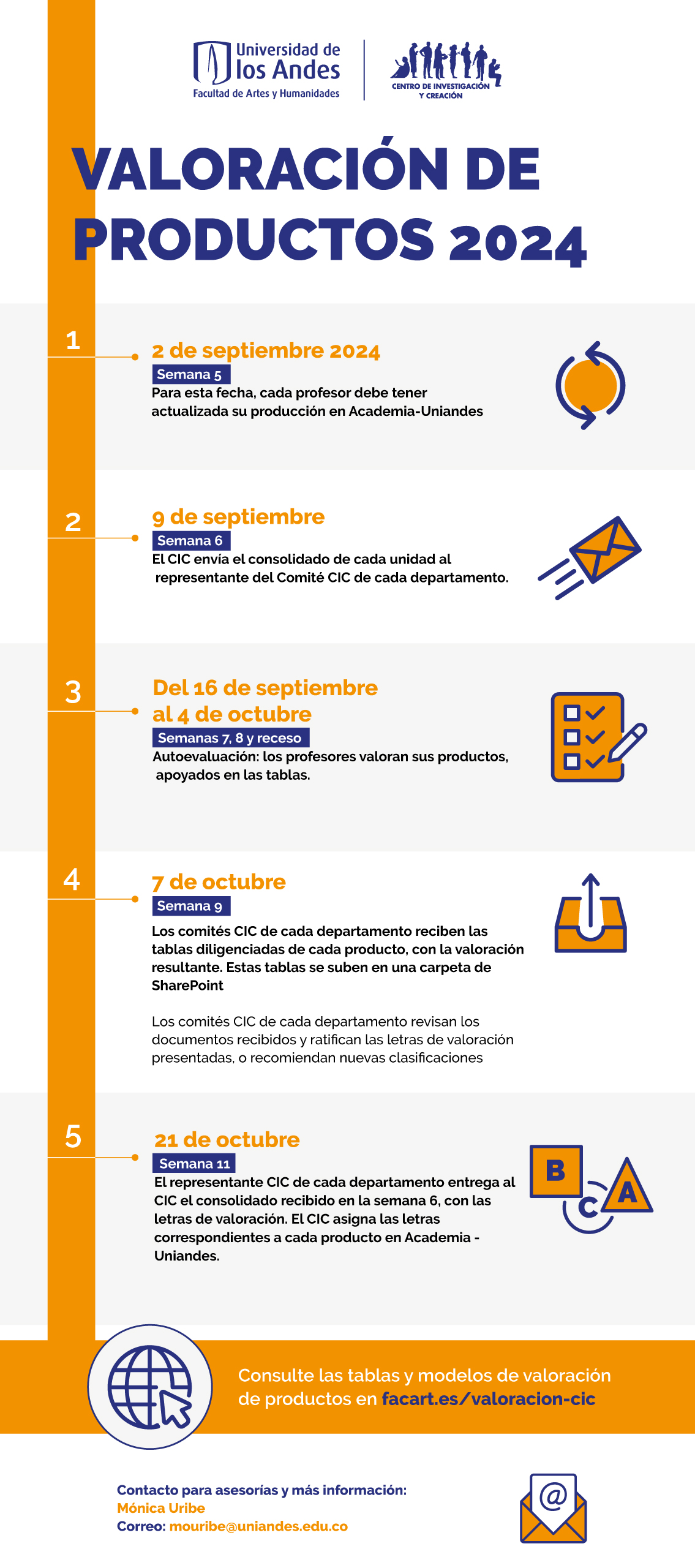 Anualmente, el CIC lidera el proceso de clasificación de los productos de creación e investigación, según el procedimiento estipulado por el Comité CIC. A continuación, encontrará una descripción de los procesos de valoración de los productos de la facultad, así como los lineamientos para la valoración y las tablas de valoración para la medición de cada uno de los productos resultados de la investigación o de la creación.